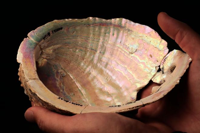 アワビの殻は、パイの皮のような「積層構造」になっていて、厚さ1ミリメートルの中に薄い板が1000枚以上重ねられているそうです。貝殻の内側は真珠のような光沢を帯びて輝く真珠層があります。積層構造によって、波長の異なる光が干渉し合うことにより虹色に輝きます。真珠層をもつ貝殻は螺鈿細工やボタンの材料として利用されており、縄文時代にもイタボガキや淡水産のイシガイ科などがアクセサリーの素材として利用されています。