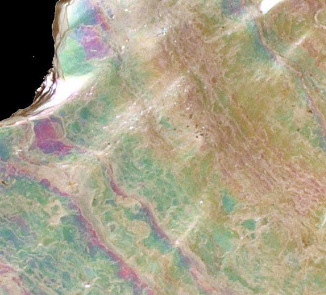 じっくり観察すると、内面に縞々の模様が浮き出ていることに気づきました。下の拡大写真をみるとよくわかると思います。縞々の正体は見当が付きました。以前、アワビの殻を使ってアクセサリーを作るときに表面を磨いていくと、虹色の縞々が浮き出てきたからです。表面が凸凹なので、平らに研磨すると構造の断面が削りだされて縞々が浮きだすのです。