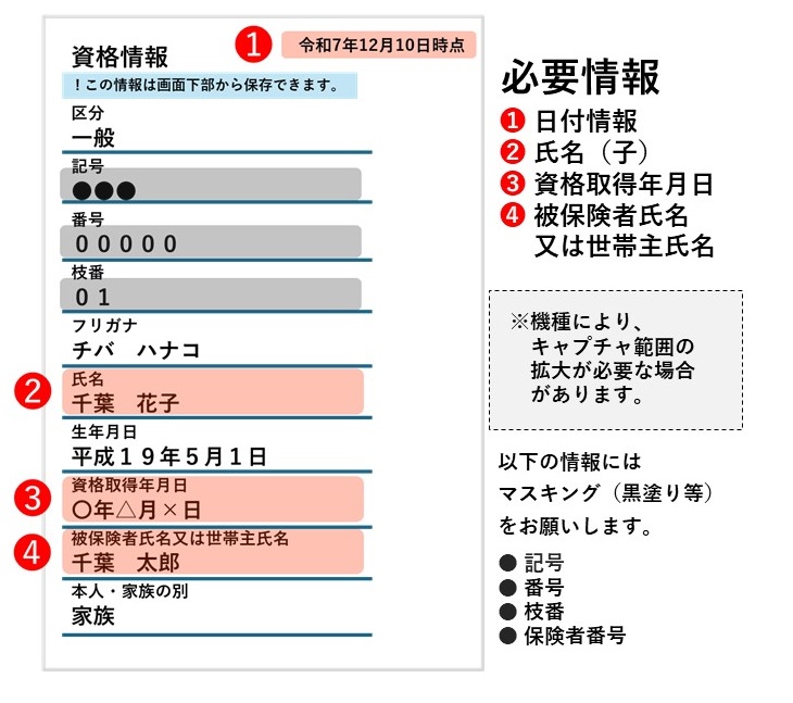 ご提出いただく健康保険証資格情報が分かる書類は、個人情報保護のため、「記号」「番号」「保険者番号」「QRコード」が見えないように、マスキング処理をお願いします。
