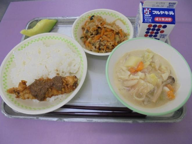 「食育の日」特別メニュー ごはん、牛乳、あじのレモン風味揚げ、たまごたっぷりスープ、スタミナにんじん、メロン 小学校資料(PDF:172KB) 小学校レシピ(PDF:233KB) 中学校資料(PDF:178KB) 中学校レシピ(PDF:224KB)