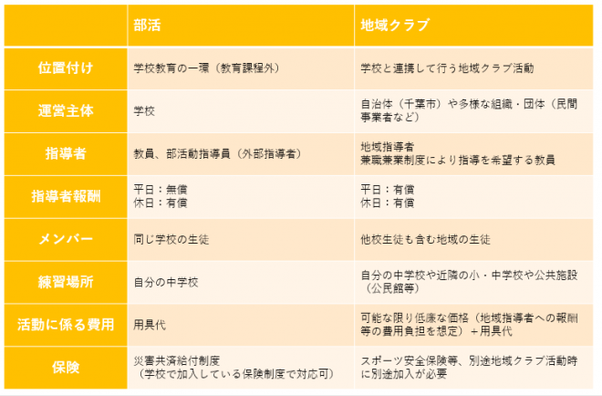 部活動と地域クラブを比較すると、そもそもの位置づけが「学校教育の一環」から「学校と連携して行う地域クラブ活動(社会教育・スポーツ文化芸術活動)」と変わることになります。今までの学校管理下での活動から、社会人などが行うサークル活動などと同じ取扱いになります。つまり、学校ではなく、地域で行われる活動となります。