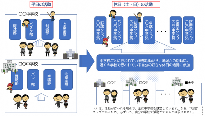 平日は引き続き部活動として顧問の先生の指導で部活動として活動し、休日の活動についてのみ地域クラブとして地域指導者の指導で活動する、といったものです。