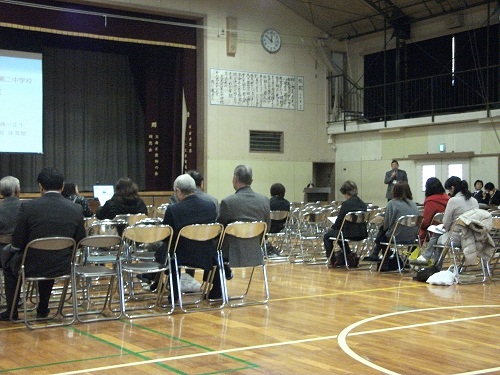 花見川第一中学校・花見川第二中学校の保護者及び地域住民を対象に開催した、平成27年4月に開校する統合校の説明会について報告します。説明会では、教育委員会から資料に基づき、統合に至る経緯と開校準備状況等について説明をしました。その後、質疑応答が行われました。