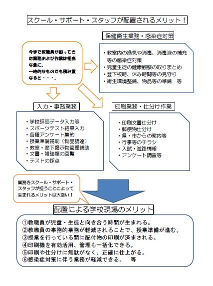 教職員が児童生徒への指導や教科研究等に注力できるように、学習プリントなどの印刷や実技教科の教材準備、データの入力等を行う。 |