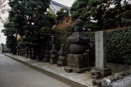 大日寺の境内に整然と並ぶ16基の五輪塔です。五輪塔は中世の上級武士階級の墓の象徴とされており、これらは千葉氏の累代の墓碑と考えられています。