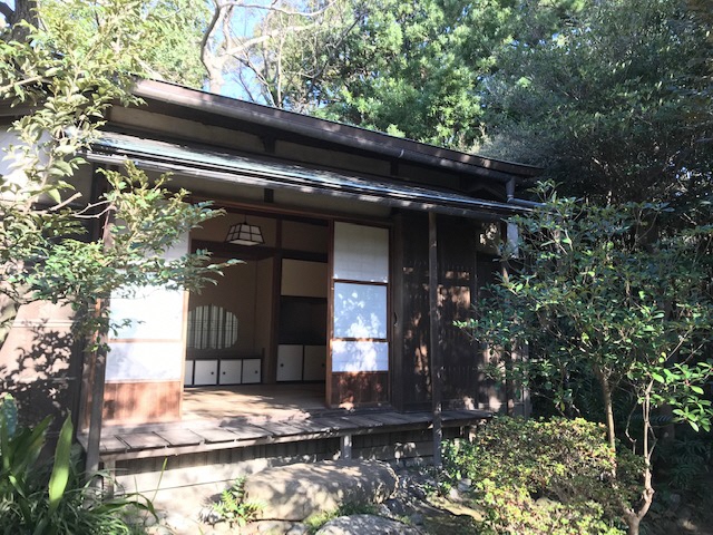 外壁が主屋の洋間のものと同じ板壁であることから、洋間を増築した時期に造られたと推定されます。室内は、6畳と床の間で構成され、床の間にはいわゆる木瓜窓が施されています。