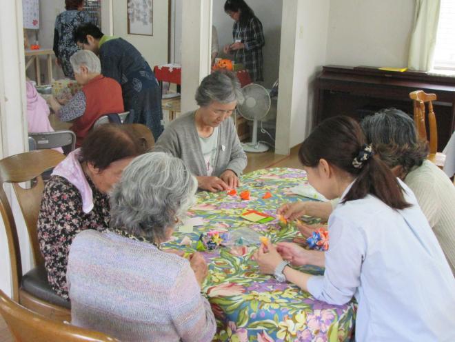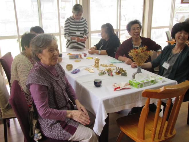 今回は10月4日に会場を訪問し、取材をさせていただきました。各テーブルに分かれ、お話をしたり、ゲームや折り紙をしたりそれぞれ参加者の興味に応じて楽しんでいる様子でした。また、近隣保育園の園児が会場を訪問し、参加者と触れあう姿も見受けられ、参加者の笑顔が印象的でした。