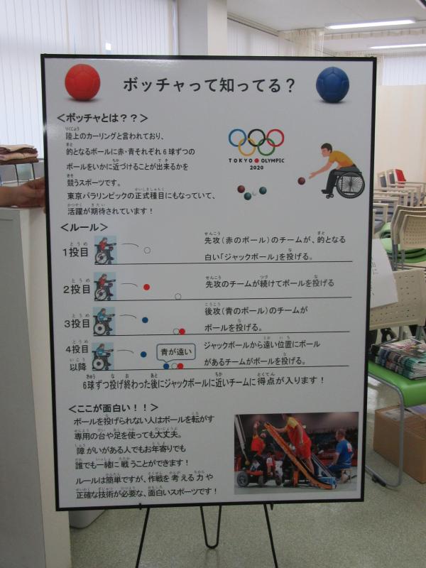 団体代表者の方のお話では、「1日で70人を超える方に体験していただきました。最初は車椅子を使って実施していましたが、車椅子を使わずにプレーに夢中になる方が多かったです。一人でも多くの方にボッチャを知ってほしいです。」とのことでした。