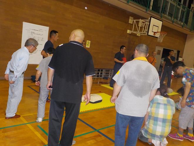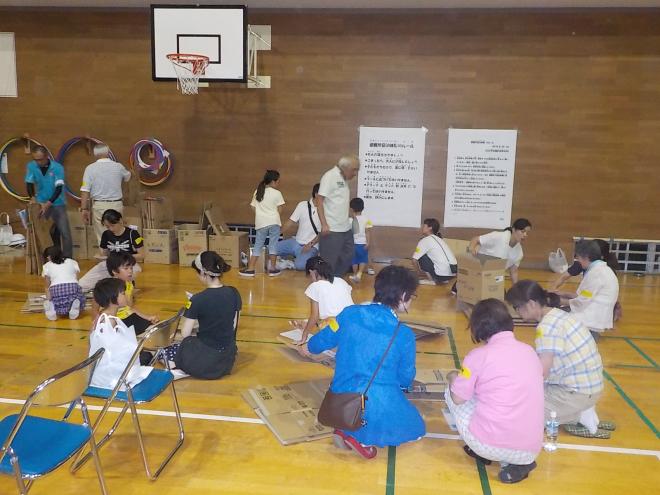 災害啓発訓練では、(1)段ボールを使った間仕切りの作成、(2)千葉市消防局による救急救命訓練(AED訓練)、(3)避難所運営委員によるロープワークの講習等を行い、参加者は3班に分かれてローテーションでそれぞれを体験しました。