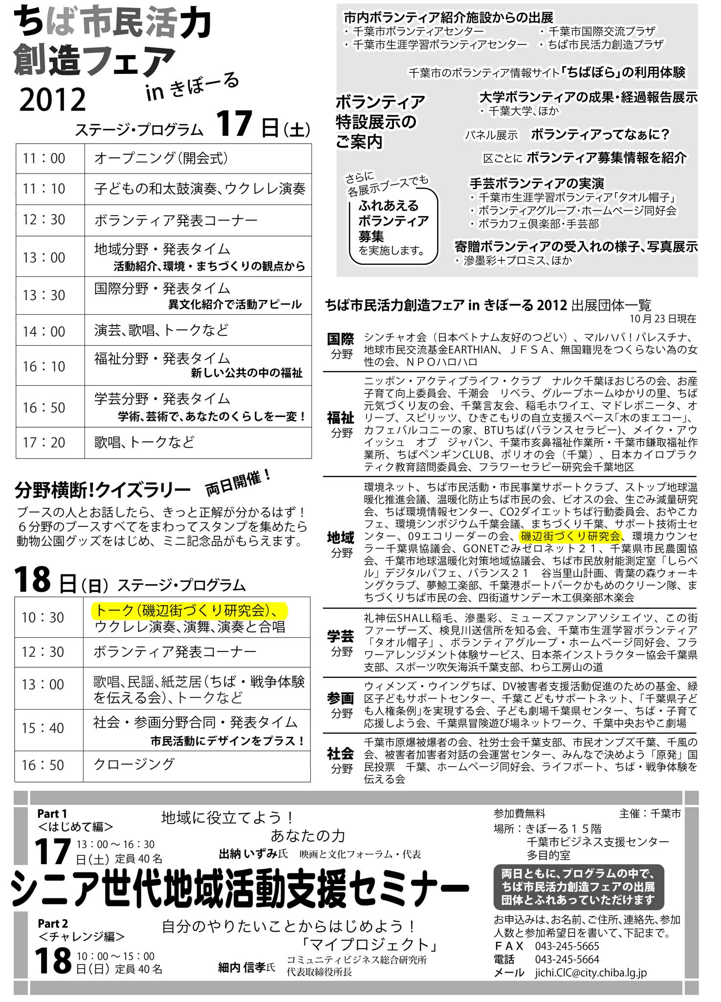 平成24年11月18日(日曜日)にきぼーるで行われた「ちば市民活力創造フェア2012inきぼーる」に団体としてブース出店及びステージ発表を行いました。