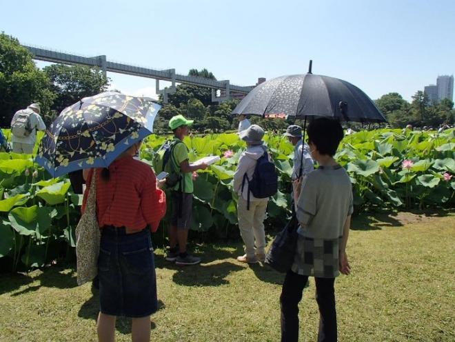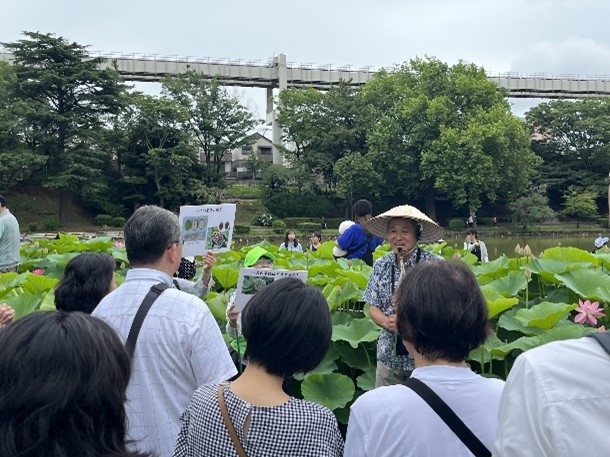ハス守さん(ボランティア)がオオガハスについて説明を行います。