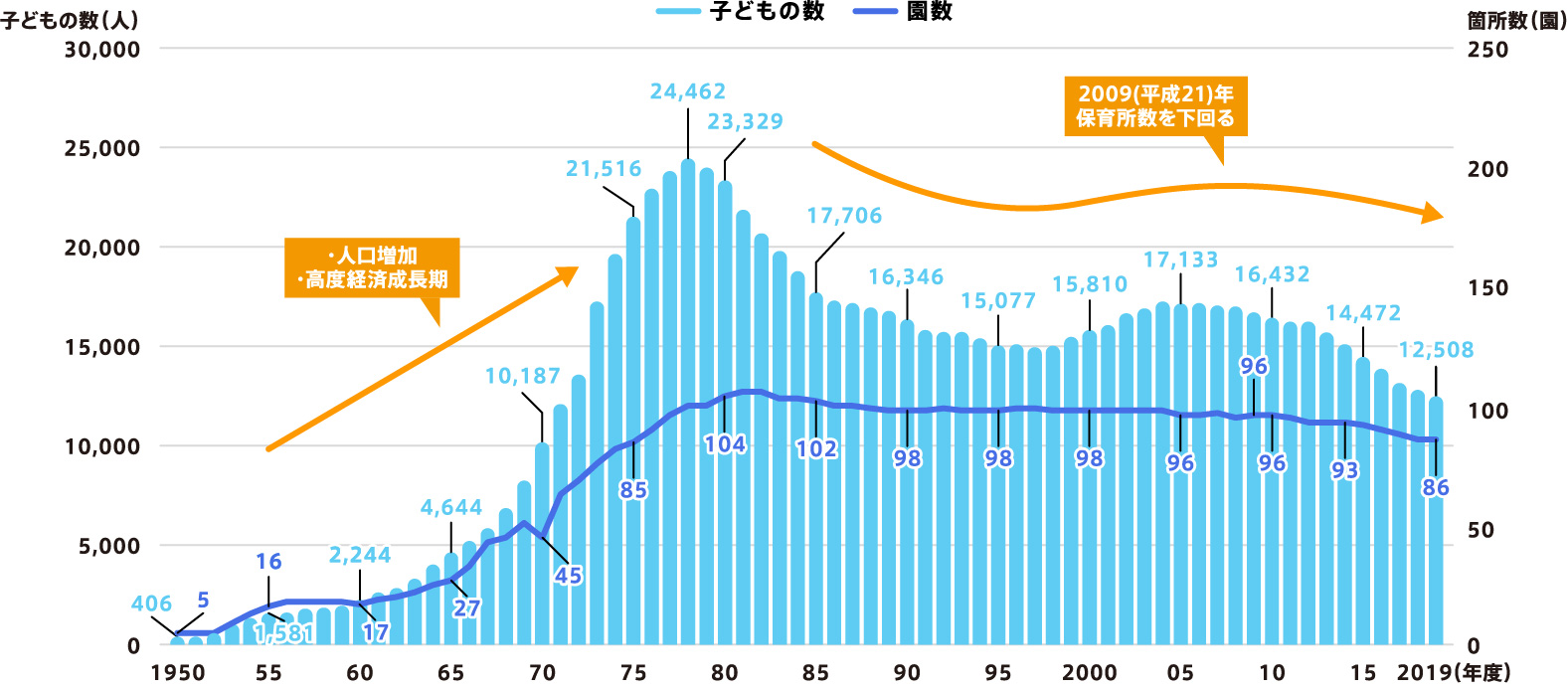- 幼稚園の子どもの数は、高度経済成長期から第二次ベビーブームの人口増加に伴い急速に増加し、ピークの1978(昭和53)年には24,462人となりました。その後は、保育需要の高まりや少子化により減少し、2019(令和元)年には12,508人となっています。