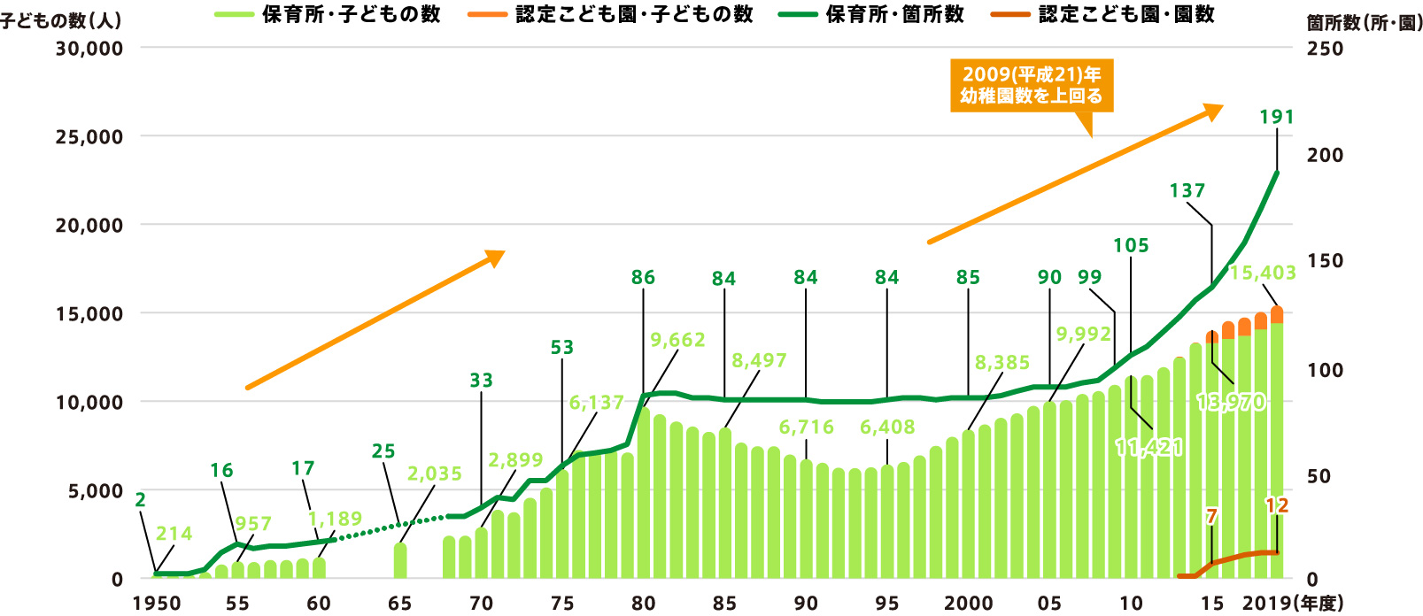 保育所等の子どもの数は、1980(昭和55)年の9,662人をピークに一時減少しましたが、共働き世帯の増加や待機児童対策等を背景に再び増加傾向にあり、2019(令和元)年には15,403人となっています。