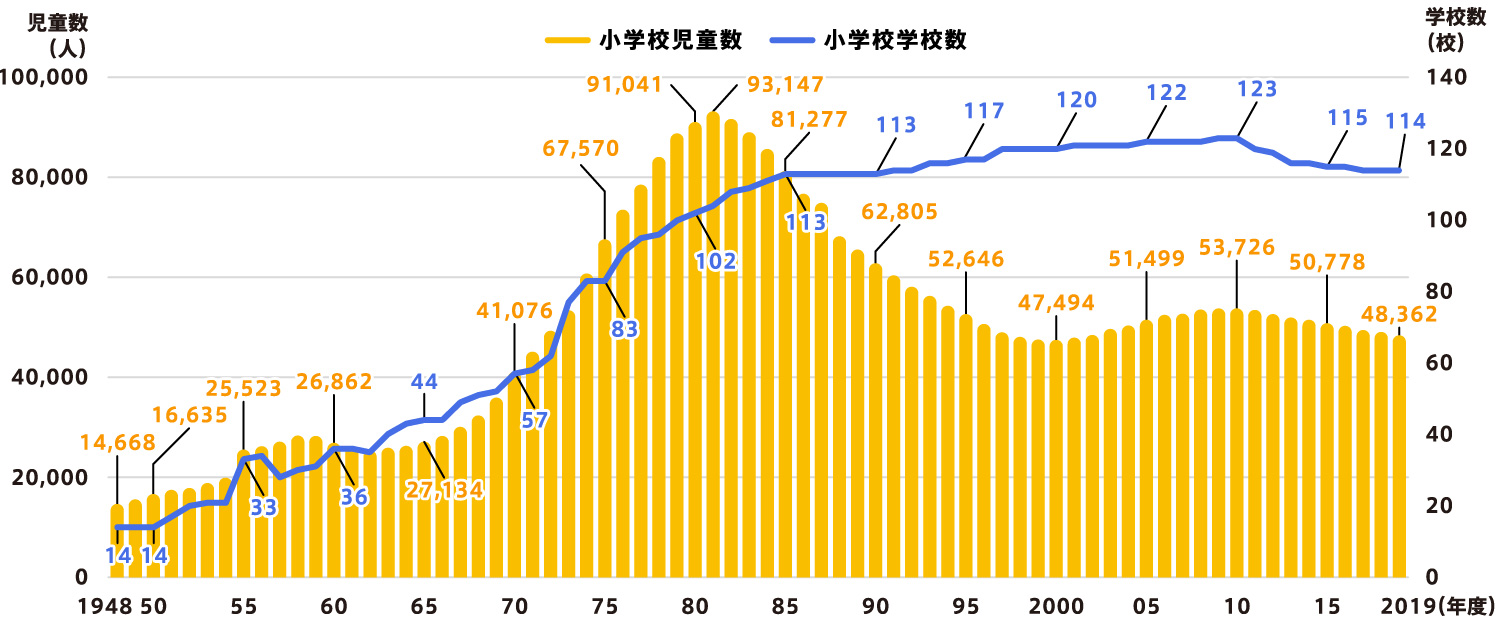 小学校児童数は1981(昭和56)年まで大きく増加、その後は減少