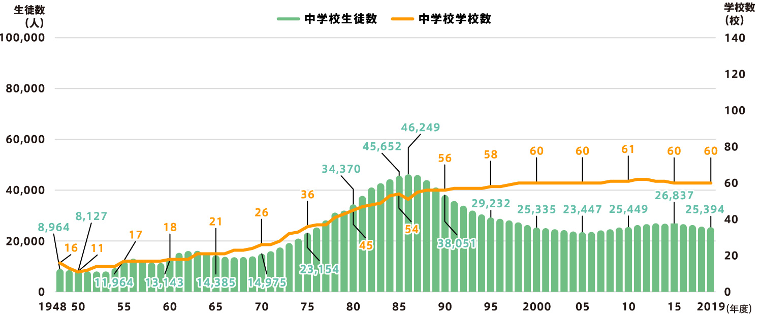 中学校生徒数は1985(昭和60)年頃まで増加、その後は減少