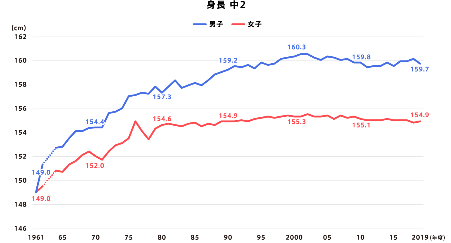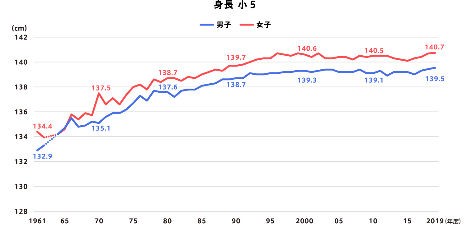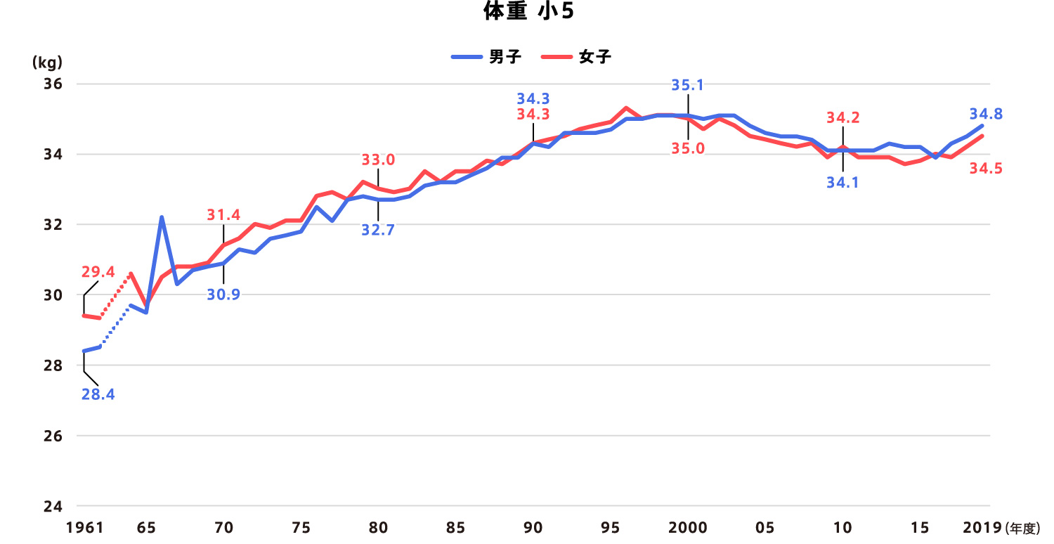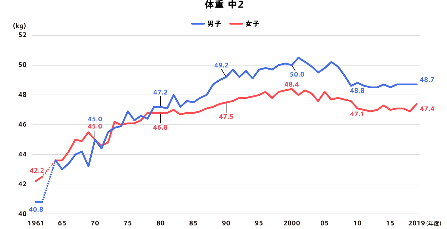 1961(昭和36)年と比べると、身長は小学校5年生で男女とも約6㎝、 - 中学校2年生は男子が約11㎝、女子が約6㎝伸び、体重は小学校5年生の男子が約6㎏、女子が約5kg、中学校2年生の男子が約8㎏、女子が約5kg増加しました。