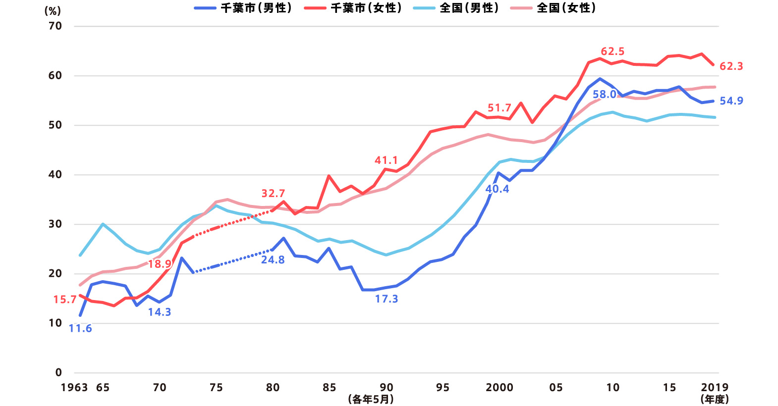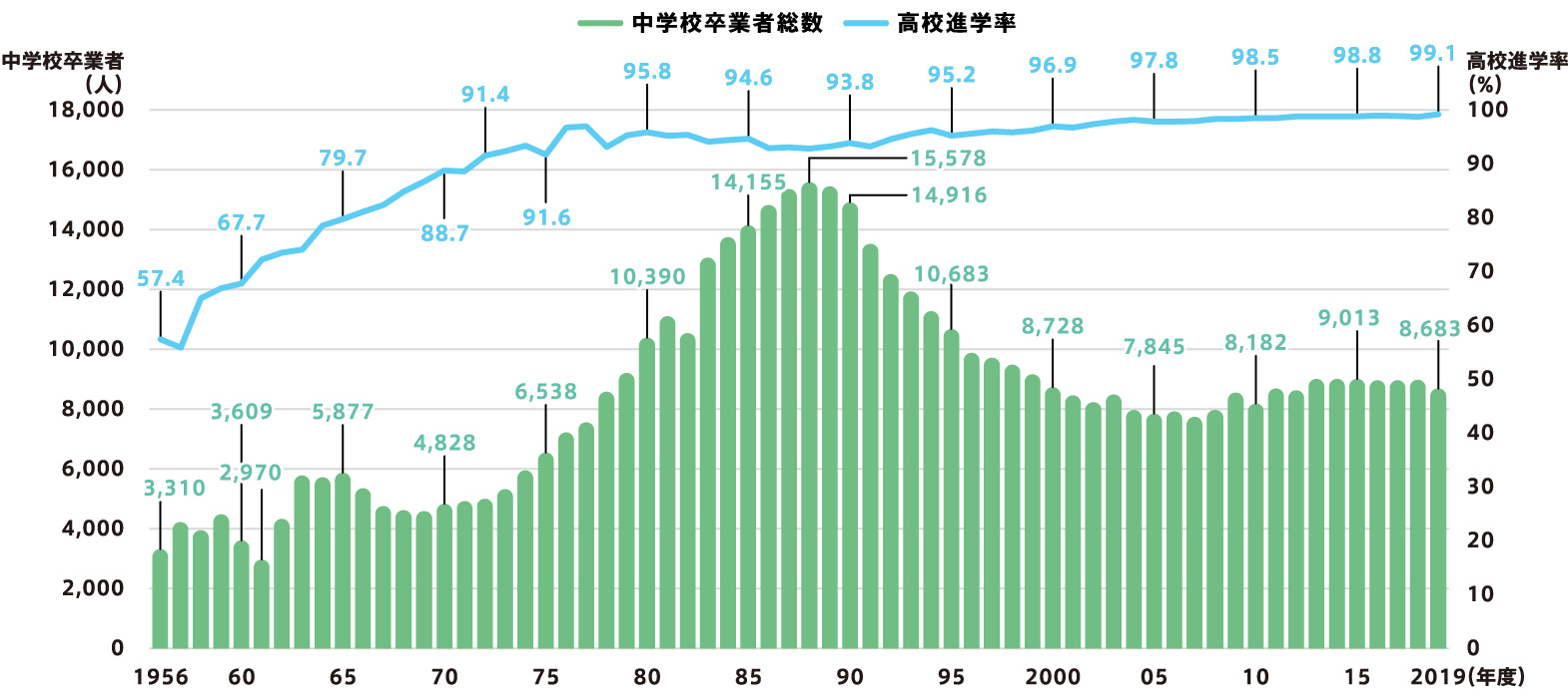 - 本市の高校進学率は、1956(昭和31)年には57%でしたが、その後大幅に上昇して2019(令和元)年には99%を超えており、中学校卒業後の大半の生徒が高校へ進学しています。