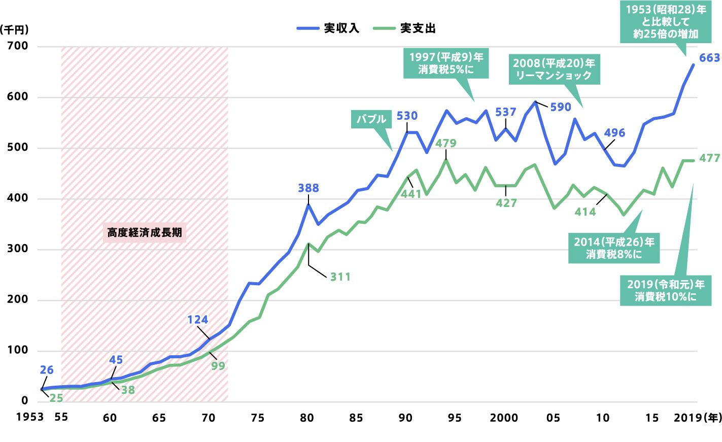 高度経済成長期を経て、家計の収入・支出ともに金額は大きく増加