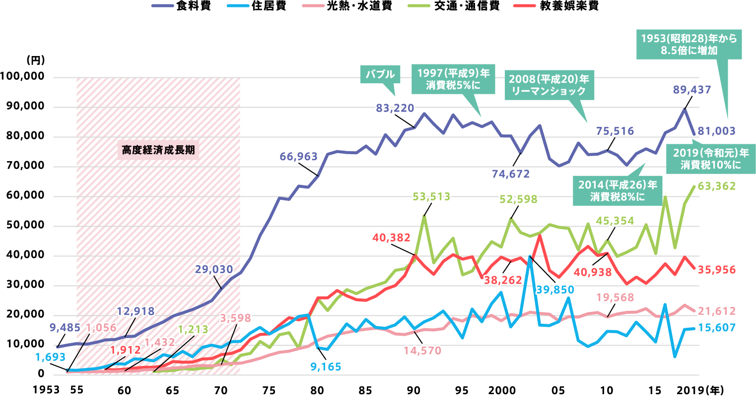 - 高度経済成長期以降、景気の拡大とともに物価も上昇し、収入・支出ともに大きく増加しました。1953(昭和28)年から2019(令和元)年までの65年間で食料費は約8.5倍になっており、また近年では交通・通信費が増加しています。