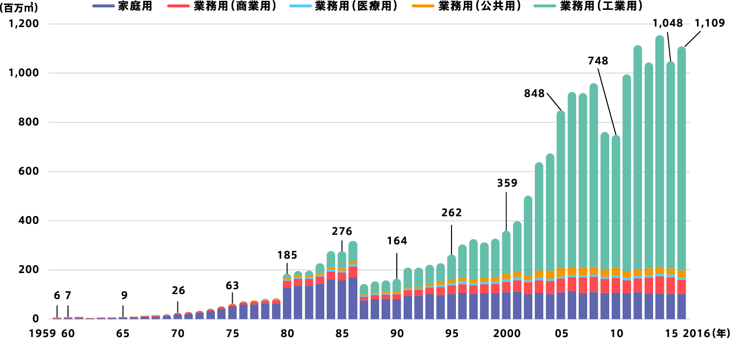 ガス消費量は2000(平成12)年頃から工業用を中心に大きく増加