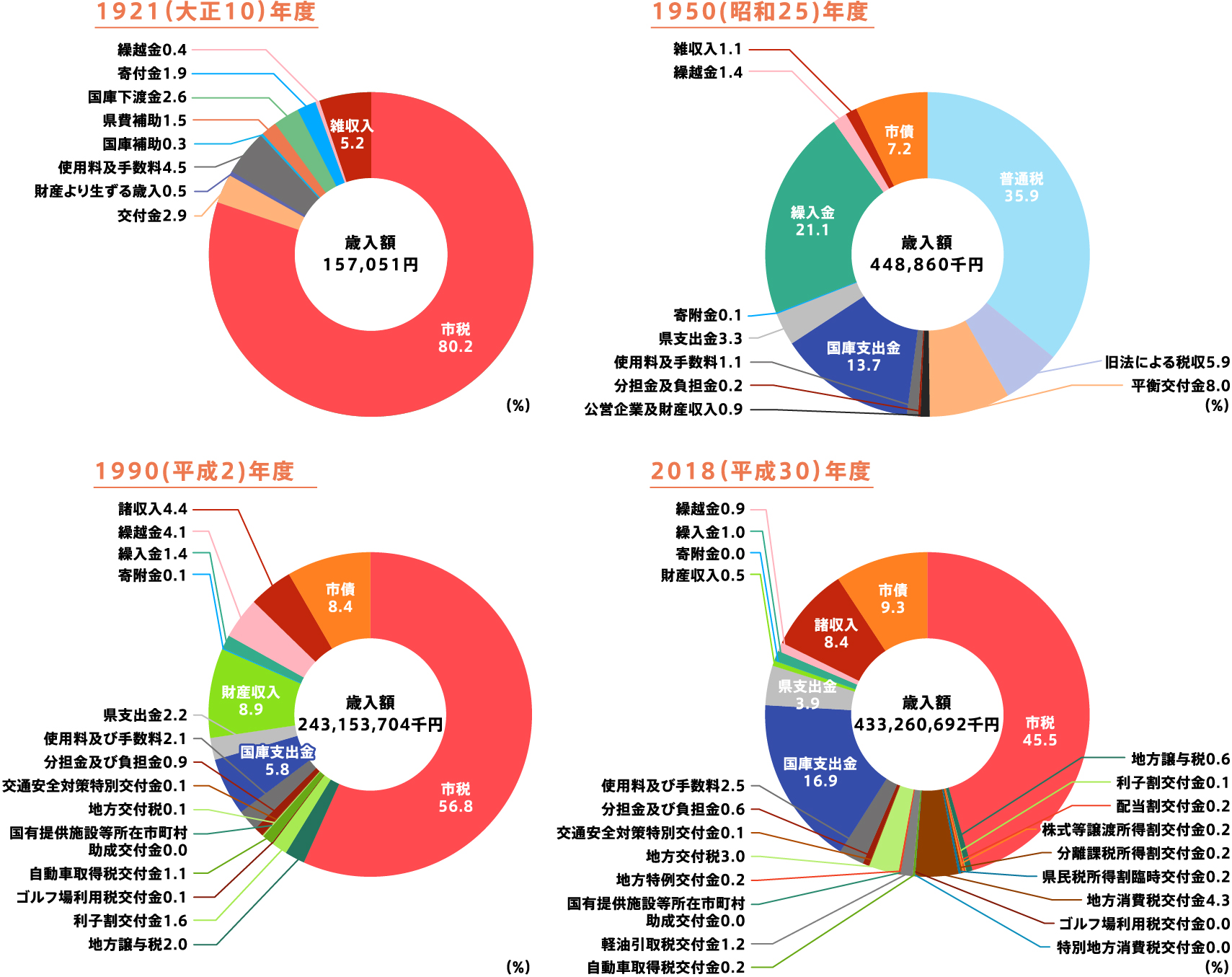 - 市制施行時の1921(大正10)年度の歳入・歳出額はともに157,051円でした。以降、近隣町村との合併や人口の増加に伴い財政規模も拡大し、2018(平成30)年度には一般会計の歳入額約4,330億円、歳出額約4,300億円に達しています。