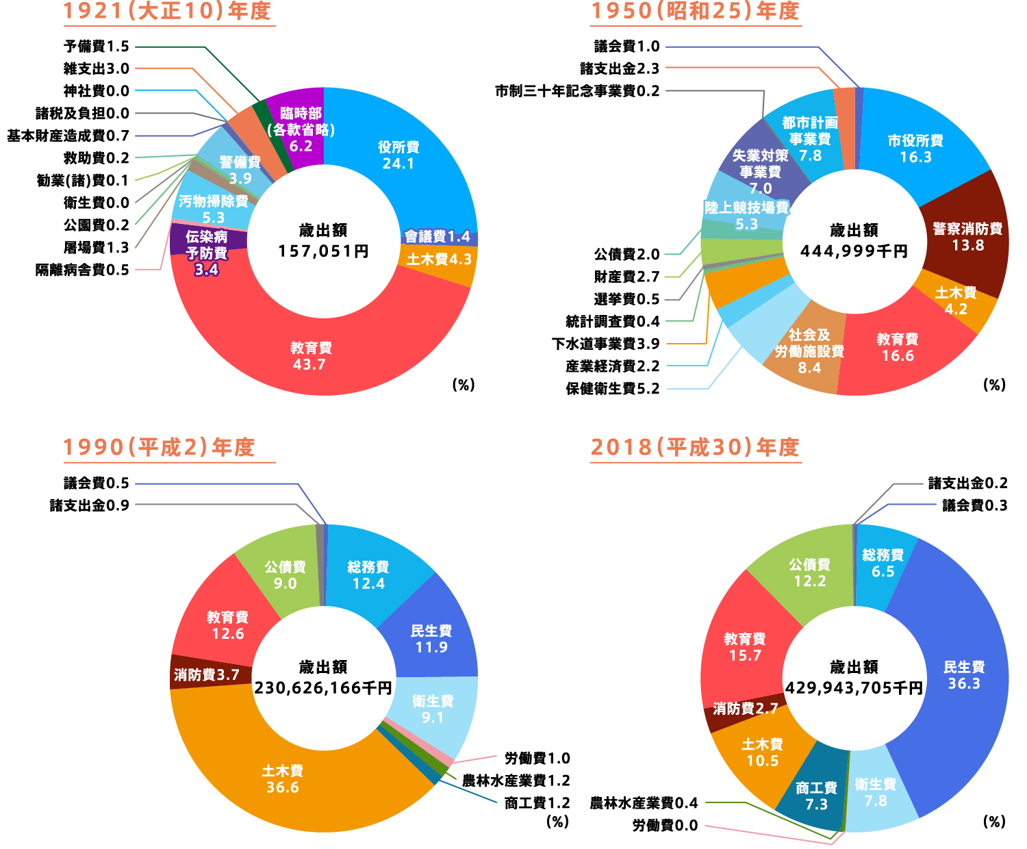 - 歳出の内訳をみると、1921(大正10)年度から1950(昭和25)年度までは教育費が第1位でしたが、以降は土木費が増加し、近年では民生費が最も大きな割合を占めています。