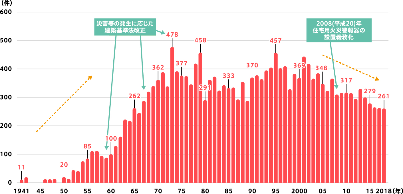 - 火災発生件数は、人口や住宅の増加に伴い1960(昭和35)年頃から増加し、ピークの1973(昭和48)年には年間478件の火災が発生しました。その後は、耐火構造や非木造住宅の増加、住宅用火災警報器の設置義務化等もあり減少傾向が続いています。