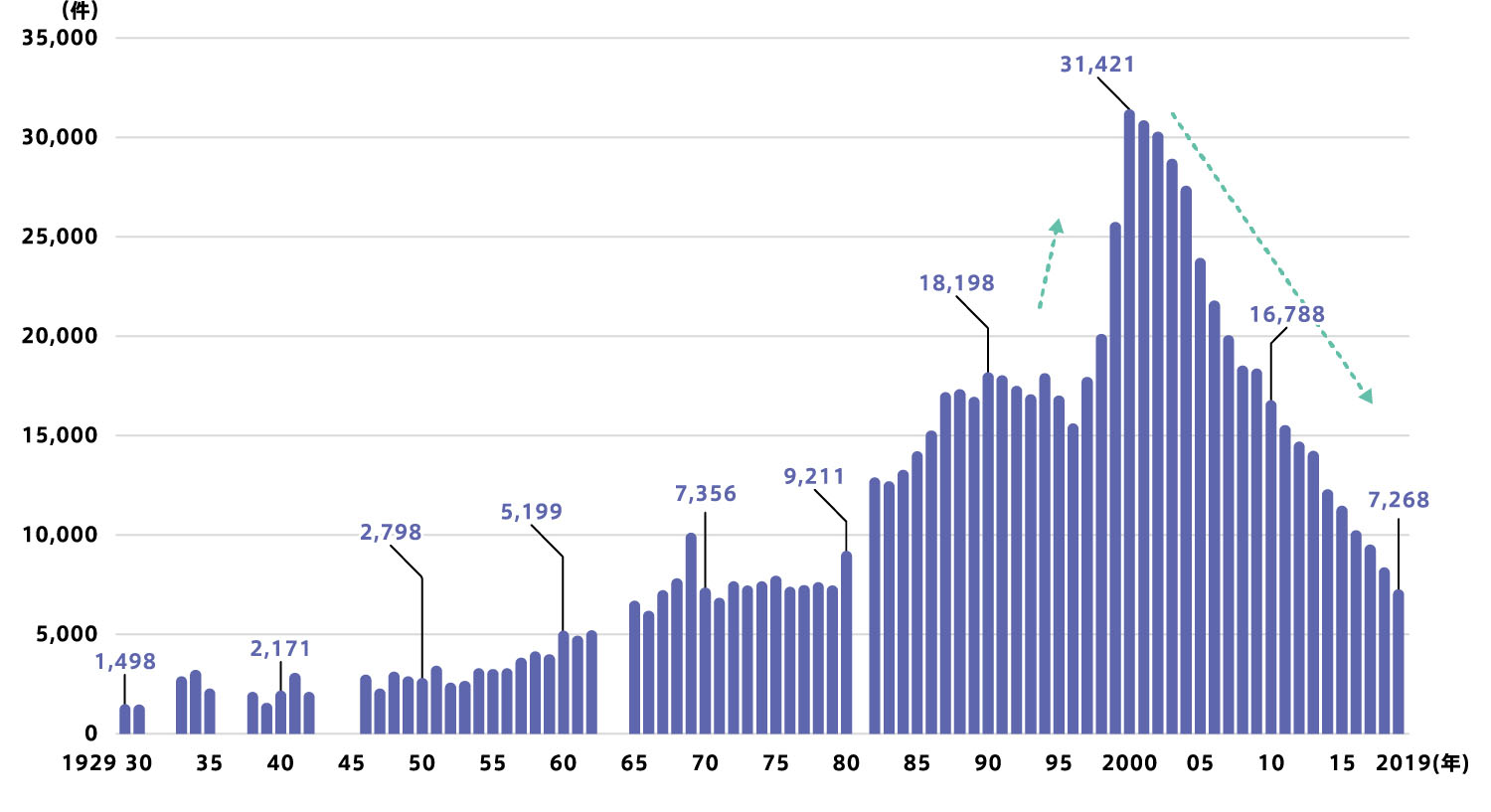 - 本市の刑法犯認知件数は1980年代以降大きく増加し、ピークの2000(平成12)年には年間3万1千件を超えましたが、それ以降は減少しており、2019(令和元)年には7,268件となっています。
