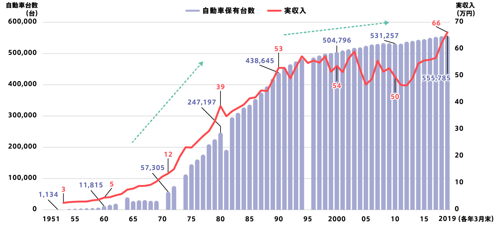 - 自動車保有台数は、1970年代から1990年代にかけて人口の増加や収入の増加、全国的なマイカーの普及などに伴って大きく増加しました。2000年代以降も増加傾向は続いており、2019(令和元)年には55万5千台を超えています。