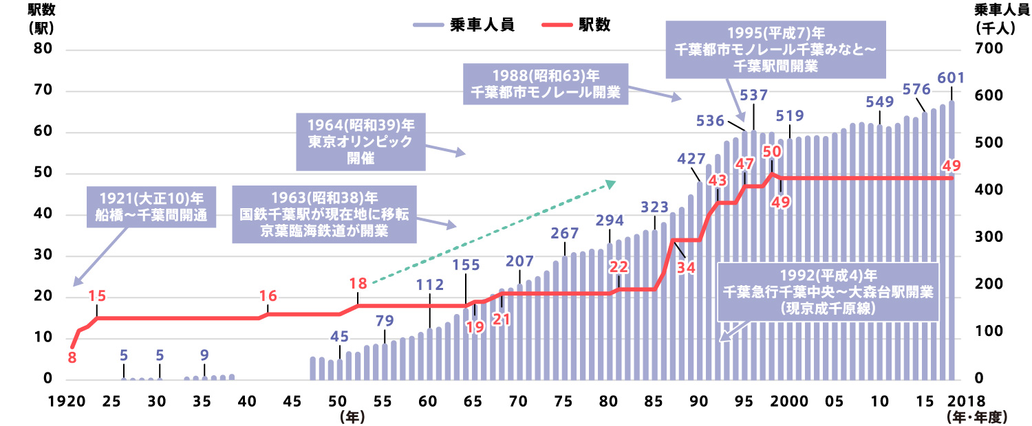 ※鉄道駅数と1日平均乗車人員はJR東日本、京成電鉄、モノレール、千葉急行電鉄(1992(平成4)~1998(平成10)年9月まで)の数値を足し上げた数である。各鉄道会社により年または年度の数値が混在している。 ※乗車人員について、1920(大正9)~1925(大正14)年、1931(昭和6)~1932(昭和7)年、1939(昭和14)~1946(昭和21)年はデータなし。