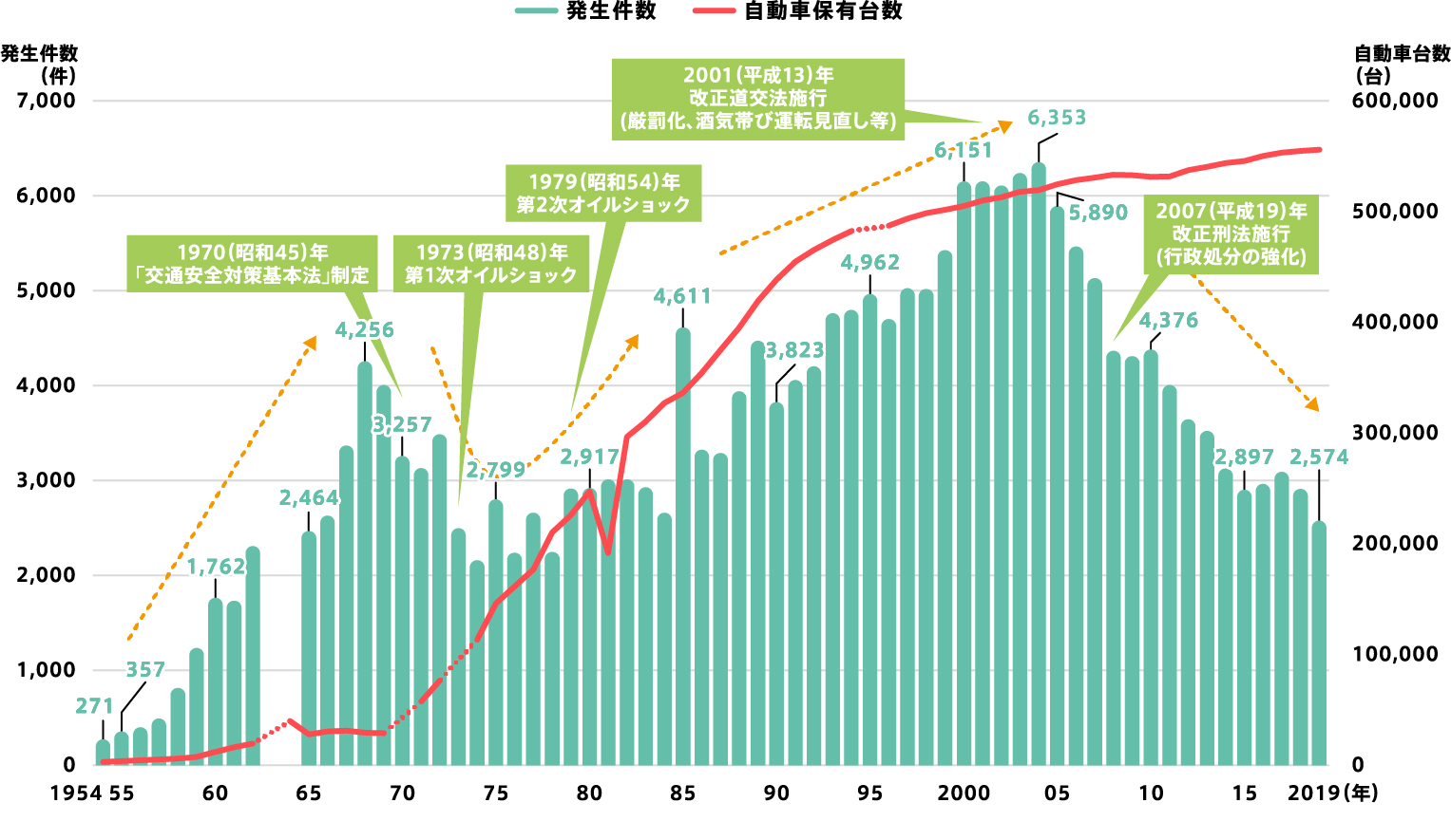 - 交通事故発生件数をみると、1954(昭和29)年以降1968(昭和43)年にかけて大きく増加しました。この時期はのちに「第一次交通戦争」と呼ばれるほど全国的にも交通事故が多く発生していた時代でした。その後は法整備やオイルショック等の影響もあり一時減少しましたが、自動車保有台数の増加に伴い再び増加し、ピークの2004(平成16)年には6,353件の事故が発生しました。