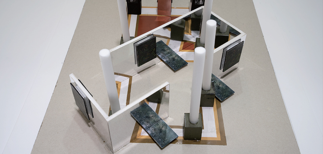 床に置かれた作品はミラーに映り込むことによって複数に増殖し、より水平面感を強調する。