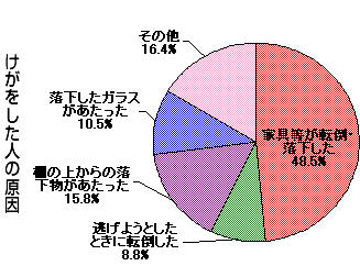 阪神・淡路大震災では亡くなった方の約8割は建物や家屋の倒壊によるもので、けがをした方の4分の3近くは家具の転倒などによるものでした。 災害発生時には、家具の転倒や散乱により逃げ遅れたりすることも十分に考えられます。各家庭では住宅の耐震化や家具の固定など、地震に対する備えをしておくことが非常に重要になります。 しかし、多くの方々が「自分の家は大丈夫」「自分だけは大丈夫」といった意識があり、家庭内対策はなかなか進んでいないのが現状です。 阪神・淡路大震災の状況を今一度思い出し、ご家庭や会社での防災対策に取り組んでください。 |