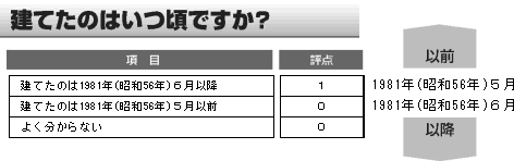説明11981年(昭和56年)6月に建築基準法が改正され、耐震基準が強化されました。 1995年(平成7年)阪神淡路大震災において、1981年(昭和56年)以降建てられた建物の被害が少なかったことが報告されています。 |