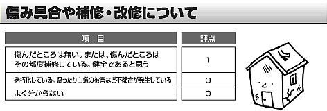 説明4お住まいになっている経験から、建物全体を見渡して判断してください。 屋根の棟・軒先が波打っている、柱や床が傾いている、建具の建て付けが悪くなったら老朽化と判断します。 また、土台をドライバー等の器具で突いてみて「ガチガチ」となっていれば腐ったり白蟻の被害に遭っています。 とくに建物の北側と風呂場廻りは念入りに調べましょう。 白蟻は、梅雨時に羽蟻が集団で飛び立ったかどうかも判断材料になります。 |