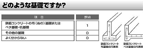 説明10鉄筋コンクリートによる布基礎・ベタ基礎・杭基礎のような堅固な基礎は、その他の基礎と比べて同じ地盤に建っていても、また同じ地震に遭遇しても丈夫です。 改めてご自宅の基礎の種別を見直してください。 |