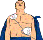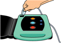 AEDは傷病者の心臓のリズムを自動的に調べ、必要な操作を音声メッセージなどで指示します。 AEDを実施したら、成功・失敗にかかわらず、ただちに心臓マッサージを開始し、心肺蘇生を行います。心肺蘇生を再開して2分(心臓マッサージ30回と人工呼吸2回の組み合わせを5サイクルほど)たつと、AEDが再度「(電気)ショックの要・不要」を指示します。以後、この手順を救急隊員や医師に引き継ぐまで繰り返します。 |