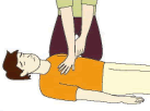 2. 圧迫胸部の下半分に、片方の手のひらの手首に近い部分を当て、その上にもう一方の手のひらを重ねる。ひじを伸ばし、胸全体が4~5cm沈むように胸骨を押す。 小児の場合は片手又は両手を用い、乳児の場合は2本の指を当て、胸の厚さの3分の1程度沈むように押す。 ![]() |