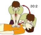 30回の心臓マッサージと、2回の人工呼吸のサイクル(30:2)を繰り返す。 ポイント●心臓マッサージ30回と人工呼吸2回のサイクルを、救急隊員が到着するまで続ける。