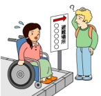 | 避難路は車いすでも通れるか、標識は外国人にもわかるか、耳の不自由な人にも避難勧告はきちんと伝わるか、といった点を点検し、いざというときに災害時要援護者が困らないようなまちの環境づくりに努めましょう。 |