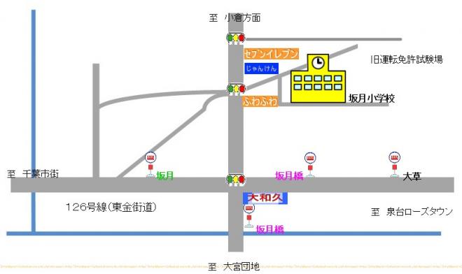 126号線(東金街道)坂月バス停または坂月橋バス停より徒歩10分 (初めての方には、坂月橋からをお勧めします。