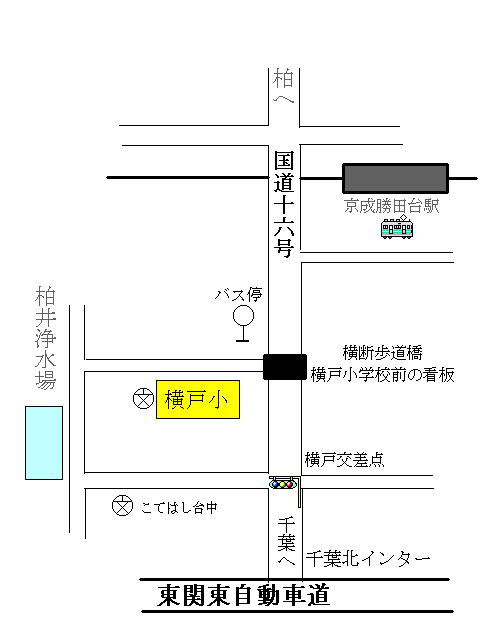 - モノレール「スポーツセンター駅」下車。同駅発の「勝田台駅」行きに乗車。「横戸小学校前」下車。徒歩1分。(乗車時間20分)
