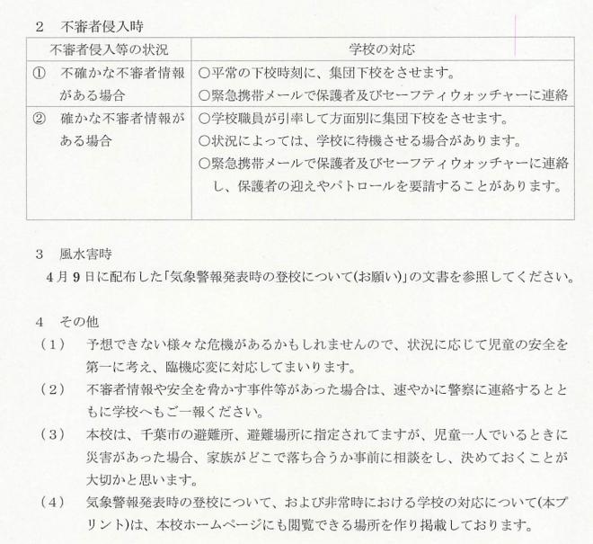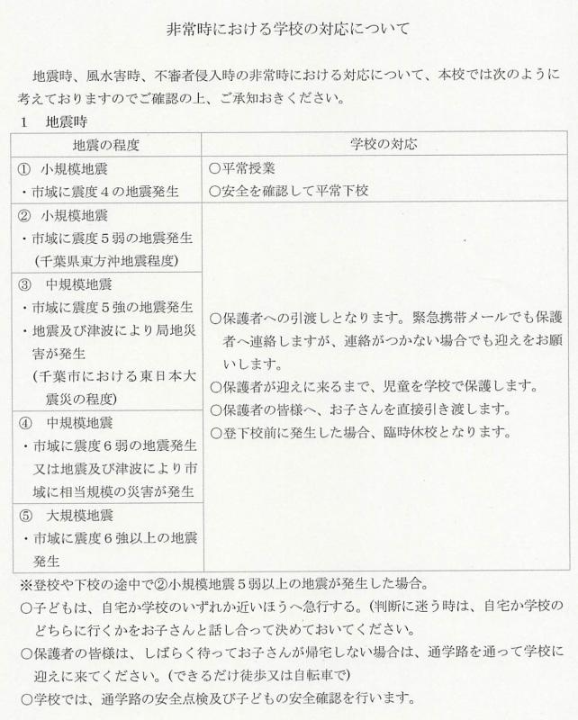 千葉市立長作小学校 > 保護者・地域の方 > 地震発生時の対応、気象警報時の対応 > 地震、不審者