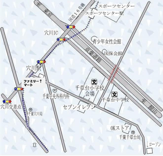 モノレール穴川駅下の交差点を入り、ファミリーマートの角を左折します。 その後直進すると、左側に千草台小学校のグラウンドが見えてきます。