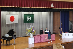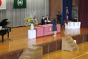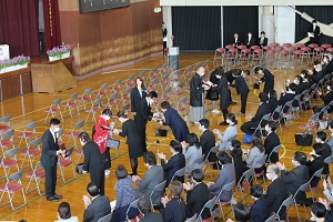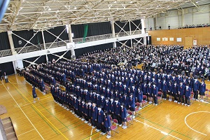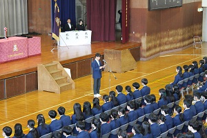 今年度も無事1年を終えることが出来ました。高校3年生・中学3年生はいませんが、体育館で初めての全校集会です。表彰式と離退任式も合わせて実施しました。