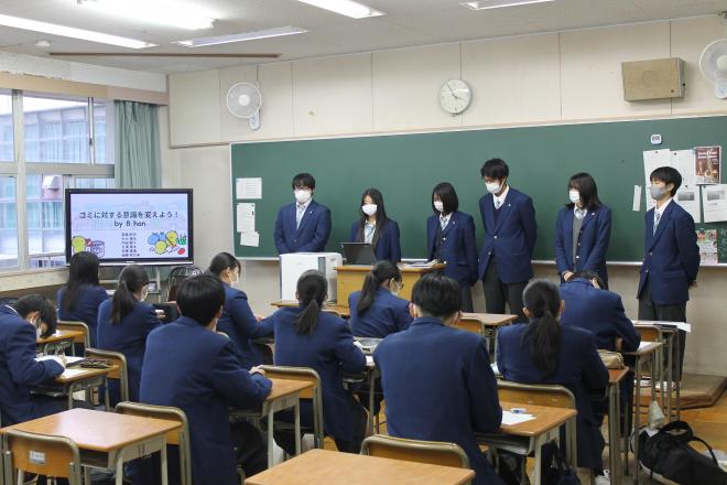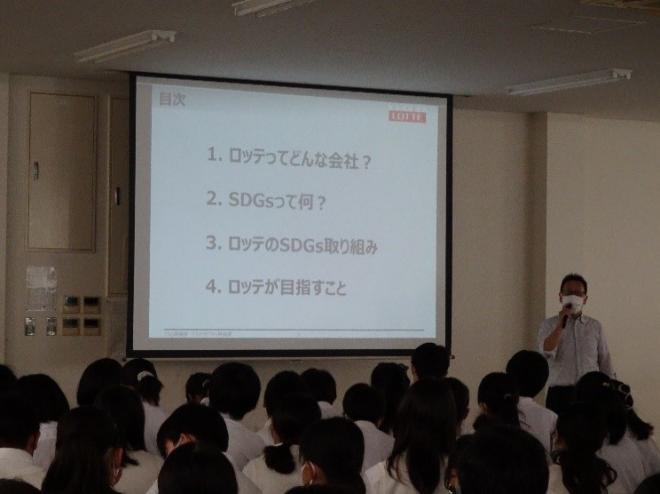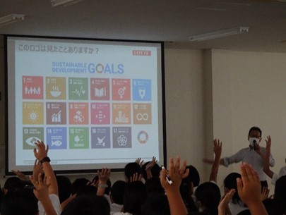 8月31日(水)、総合的な学習の時間(Inage Quest:IQ)の一環として、(株)LOTTEの佐藤様・和南城様による特別授業が行われました。SDGsについての理解を深めることを目的としたもので、「SDGsとは何か」や「SDGsへの取り組み」など、様々な内容を講義していただきました。質問の挙手が収まらず、質疑応答が30分以上続くなど、主体的な姿も見られました。現在は、校内で改善したい目標をグループごとに設定し、プロジェクトの成功に向けて取り組んでいるところです。