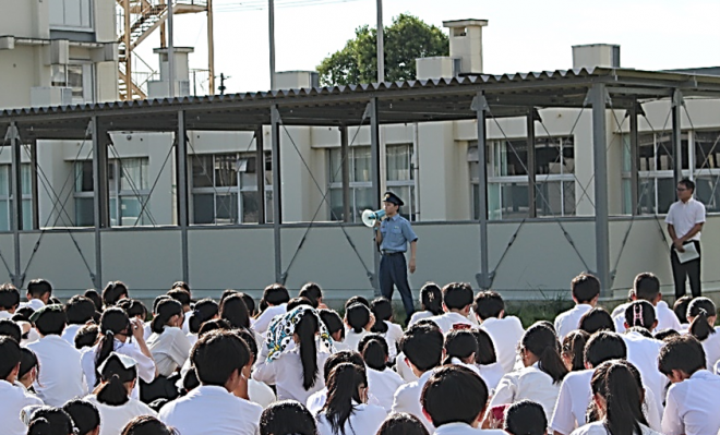 9月2日、稲毛国際中等1~3年生合同の避難訓練を実施しました。今年度初の火災を想定した避難訓練であり、どの生徒にとっても旧高洲二中の校舎に引っ越ししてから初めてグラウンドに避難する訓練でした。普段は使用しない非常階段を使うことに緊張している生徒も多くいましたが、静かに迅速な避難を行うことができました。