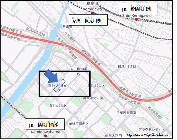 1. バス(千葉海浜交通)をご利用の場合 3番乗り場から 「5丁目経由 検見川浜駅行き」に乗車 ⇒「真砂5丁目18街区」下車 徒歩1分