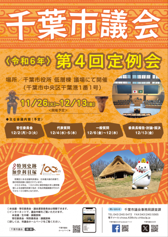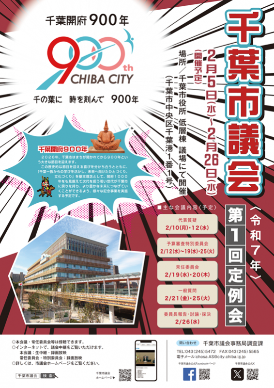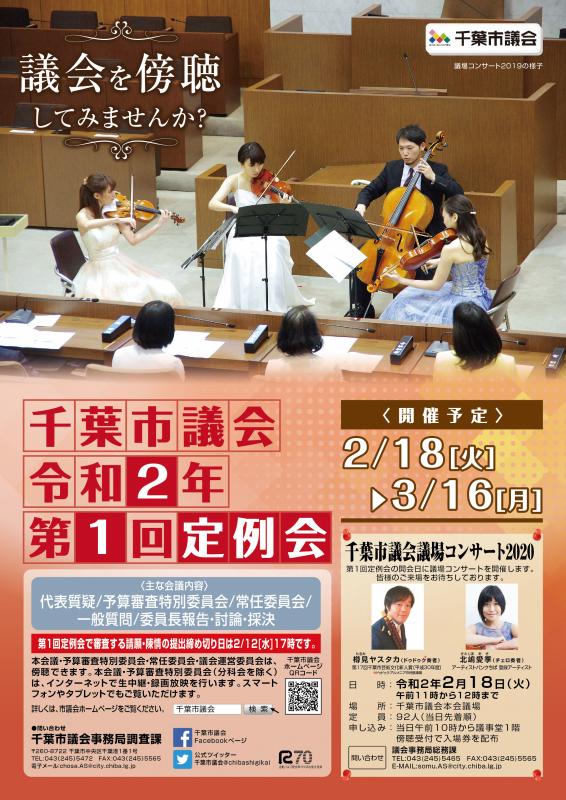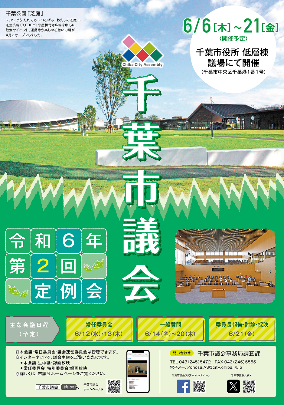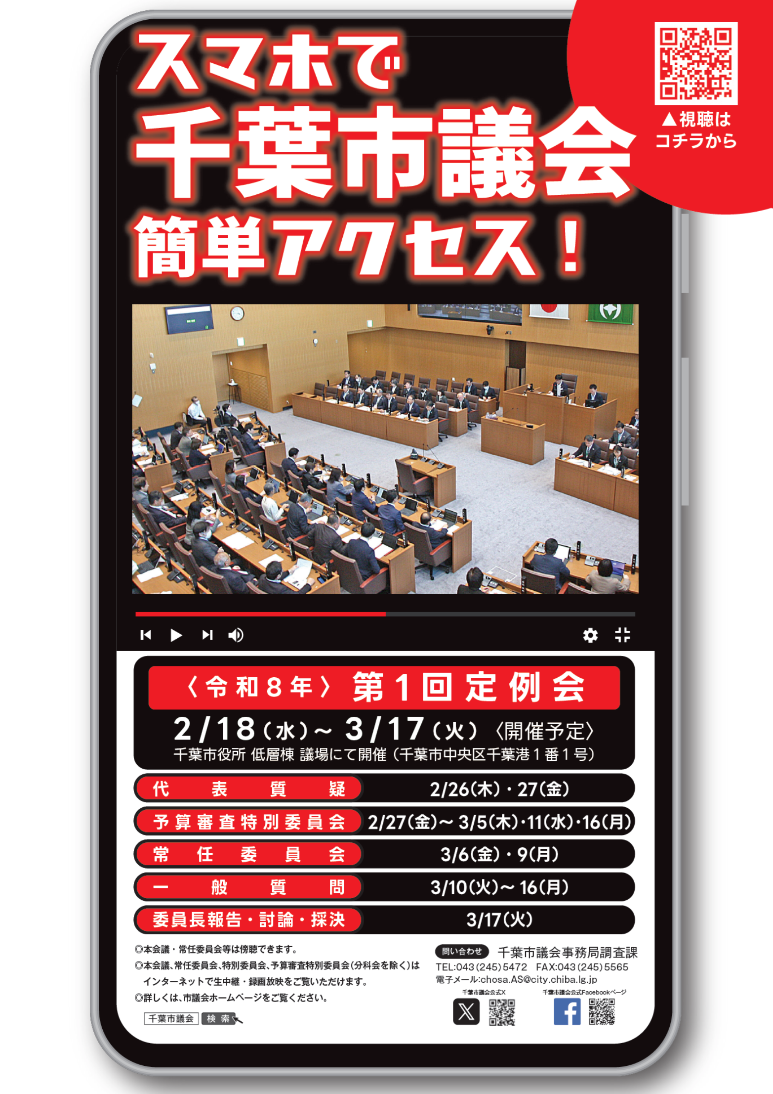 千葉市議会の定例会開催を広く周知することで、二元代表制の一翼を担う市議会の存在を市民により身近に感じてもらうとともに、市議会への関心を高めていただくため、定例会の開催告知ポスターを公共施設などで掲出しています。