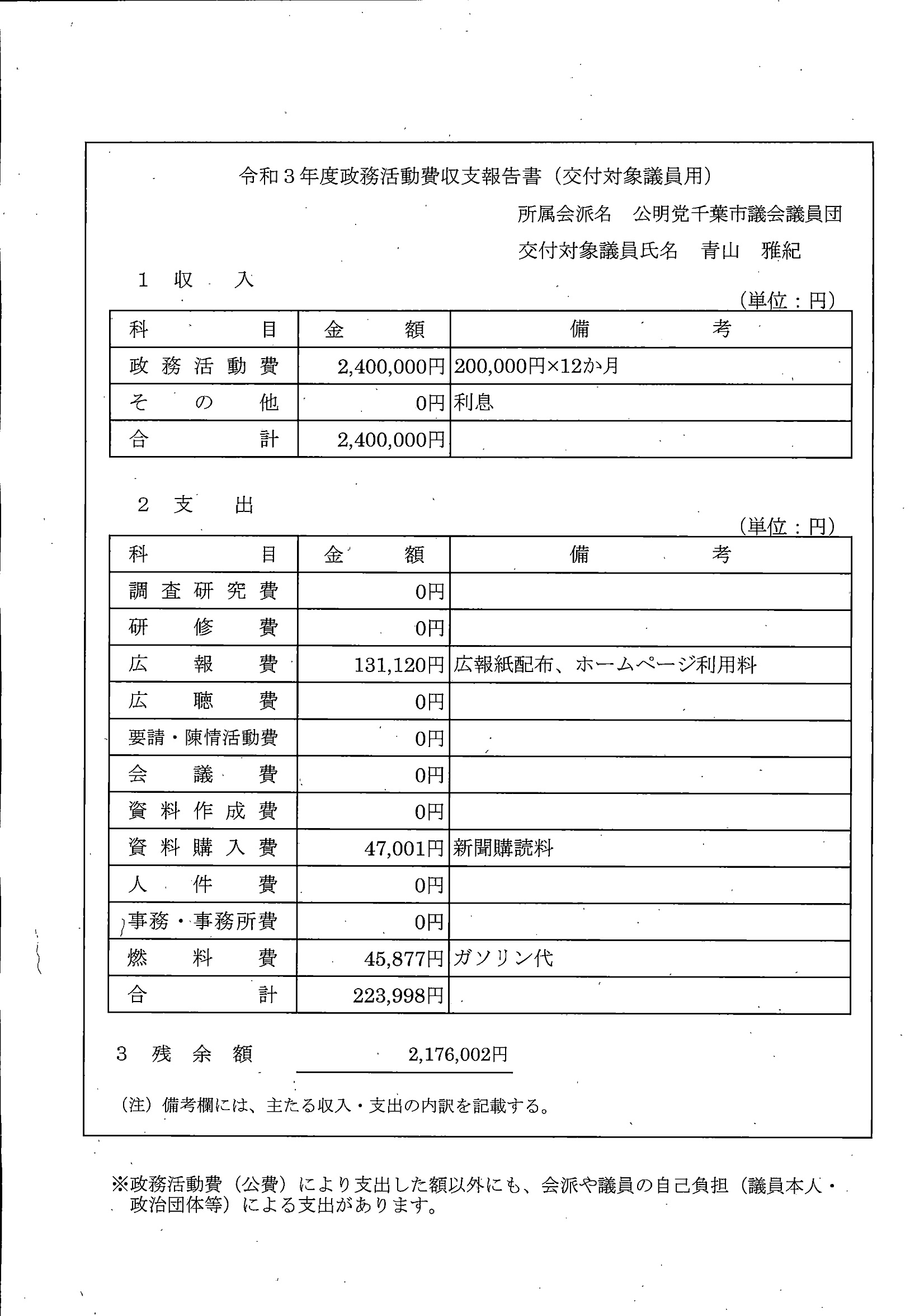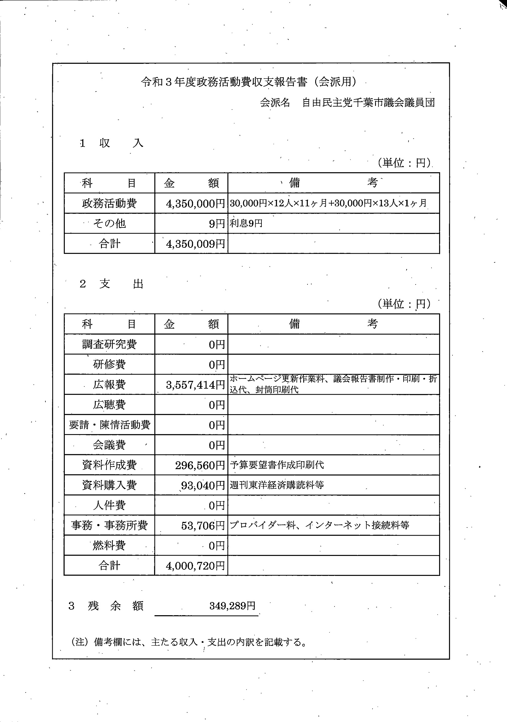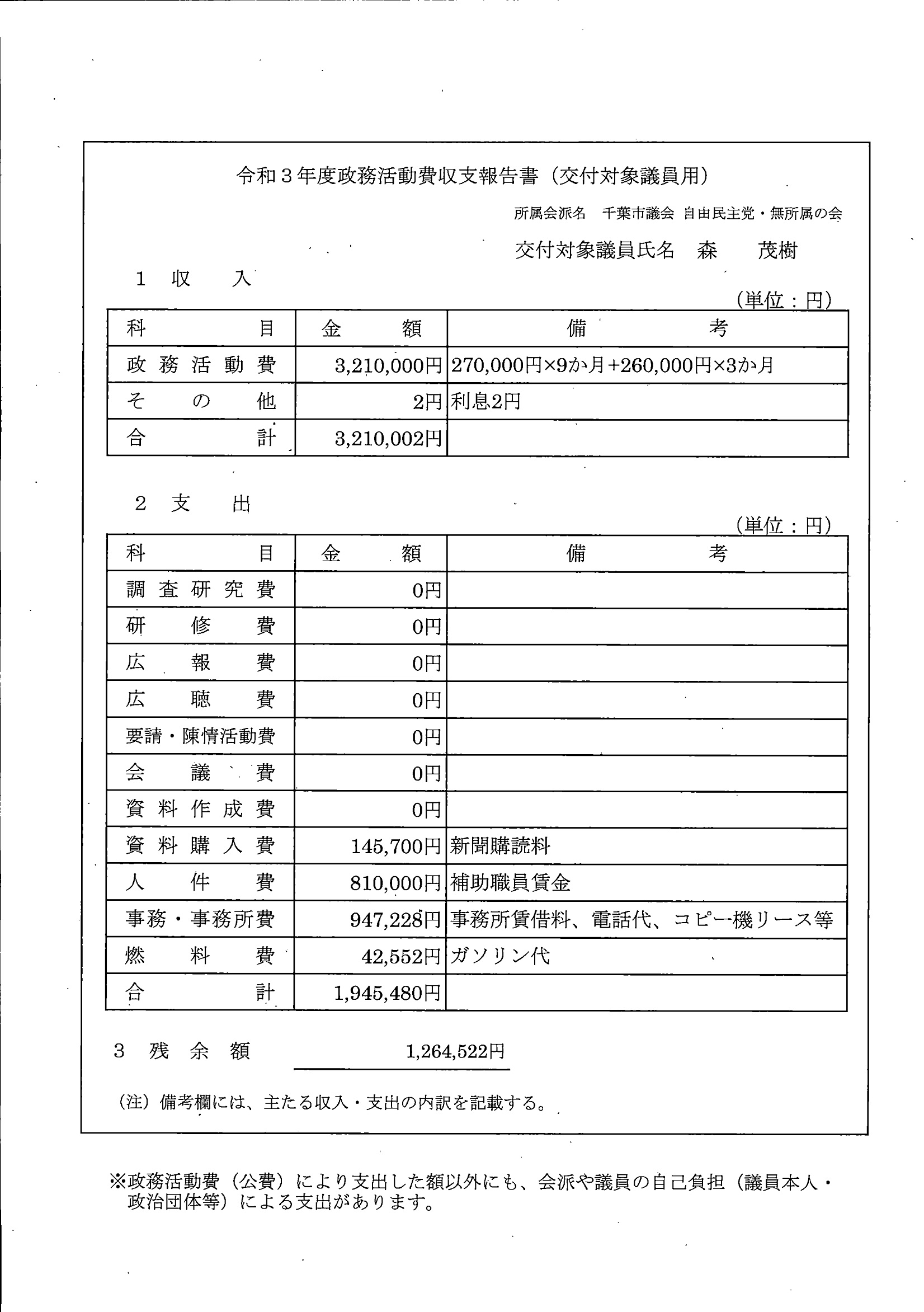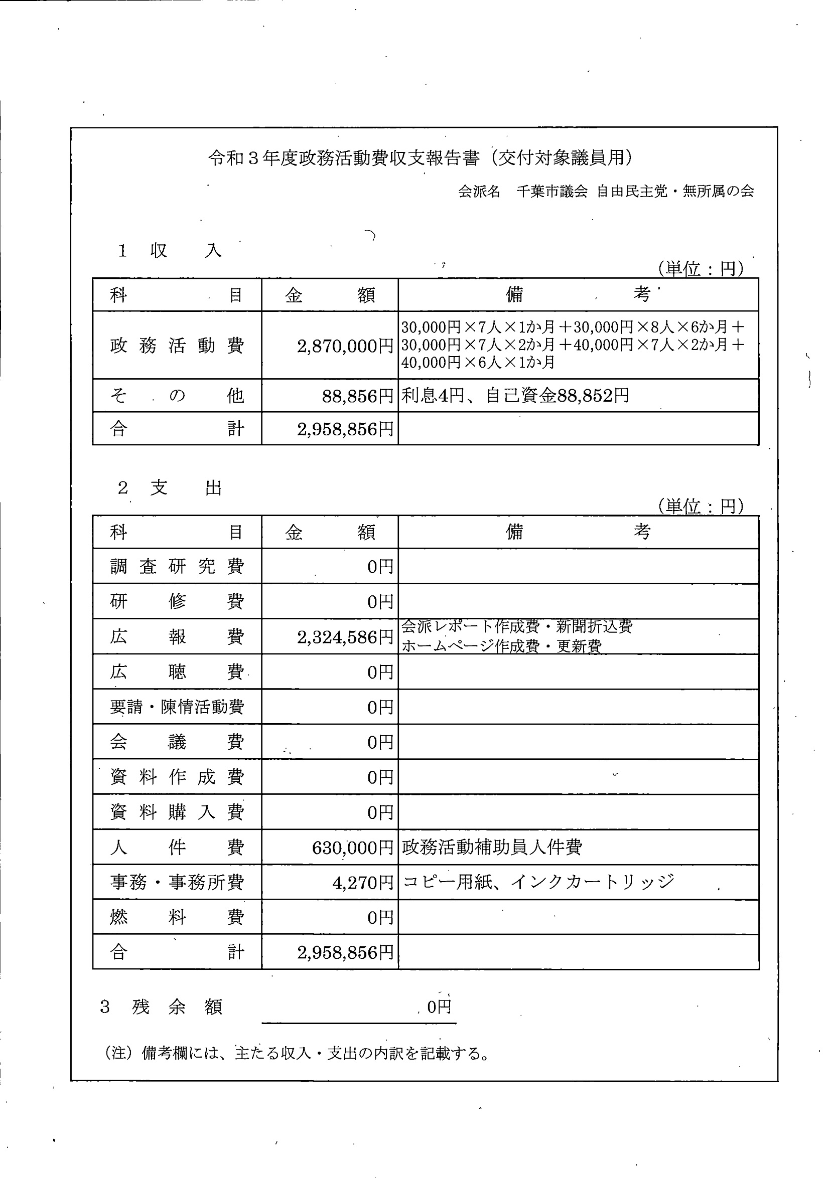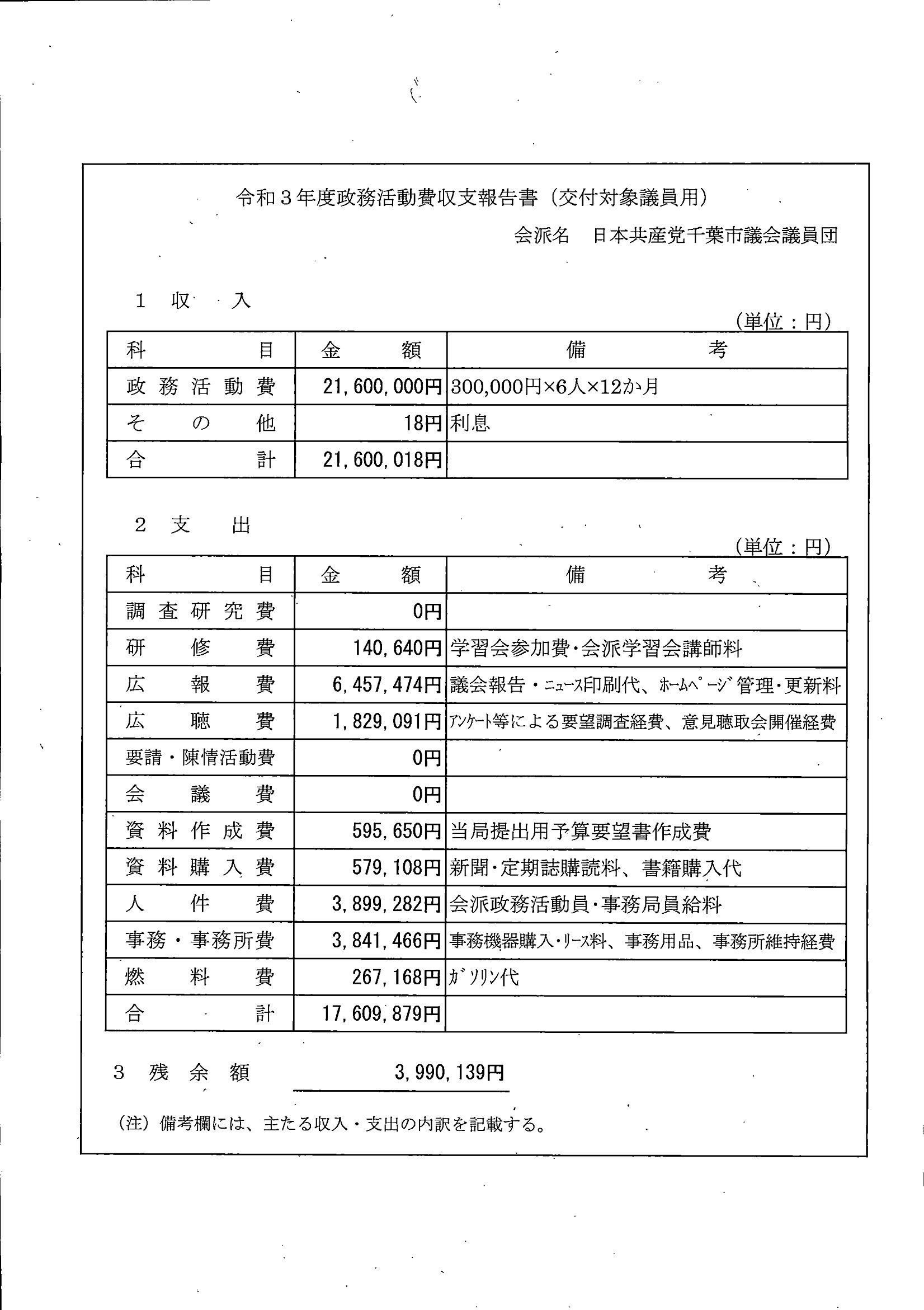 千葉市議会トップページ > 広報・情報公開 > 政務活動費 > 令和3年度交付分(政務活動費収支報告書)